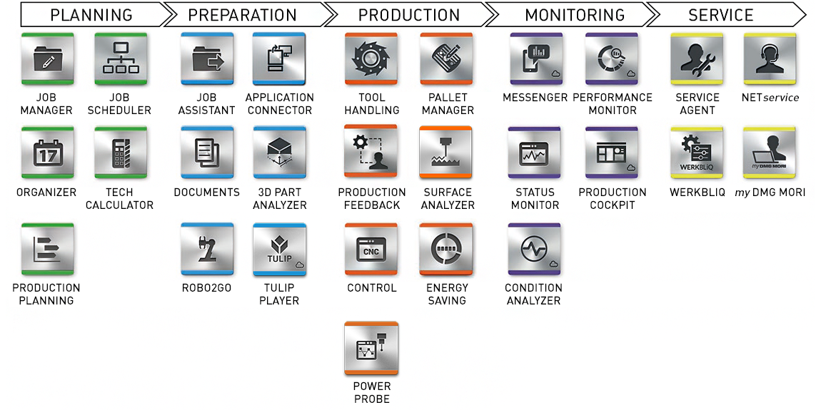 Summed up under OPEN CONNECTIVITY, DMG MORI offers CELOS devices and networking solutions for the Digital Factory.